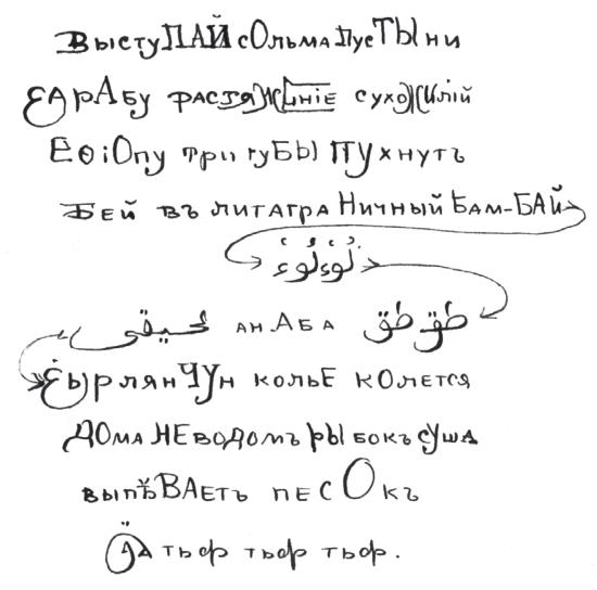 Алтык Салтык парасыонЗахитрилЧычра вымакалЧерепернь по пропохусам ухопоп без прощенияи ездит и ездит от старых к неновым узбекамв степях<1919–1920>