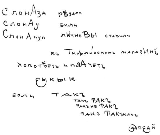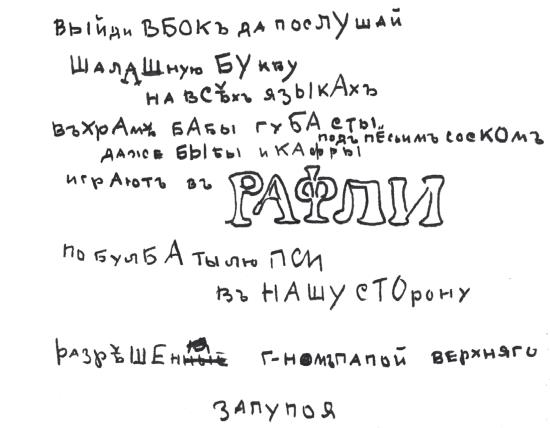 Я в ухо воткнул булавкуПотом зашёл в лавкуКупил яблоки, грушиТуши, Куши, ТурушиПотом пошёл к ТинеЗавяз в тинеЗавязли ногиУвы как многиКавалеристыИ футуристыО, бр к рукиМазурки звуки<Март 1919>