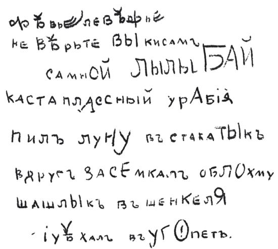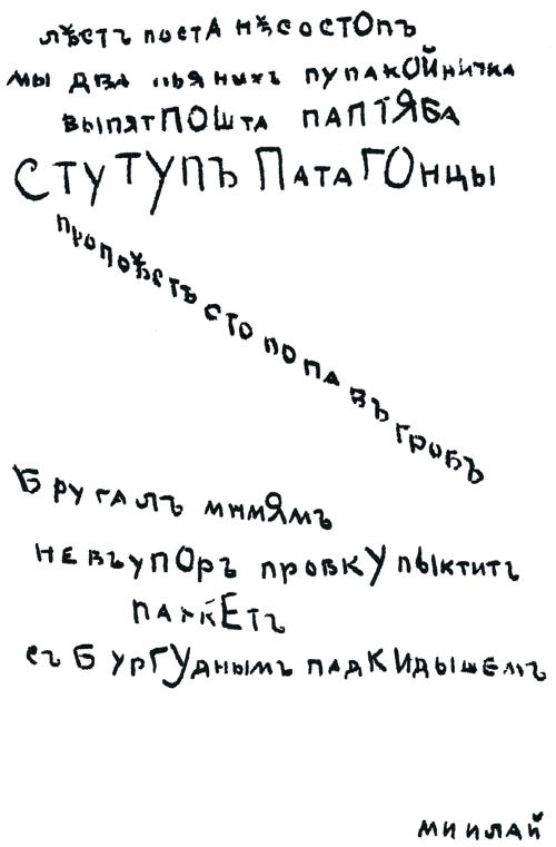 Я трЕТью ШмАмку вЫездилНа мундШТУкЕГренлАндских АпмистровНо мне никтО не поВЕрилХотя не хАн Я стАнуСтАну моНАхомно где ДОСТАНУ вЫшитые сильВЕстрами ШтАнЫ<1919–1920>