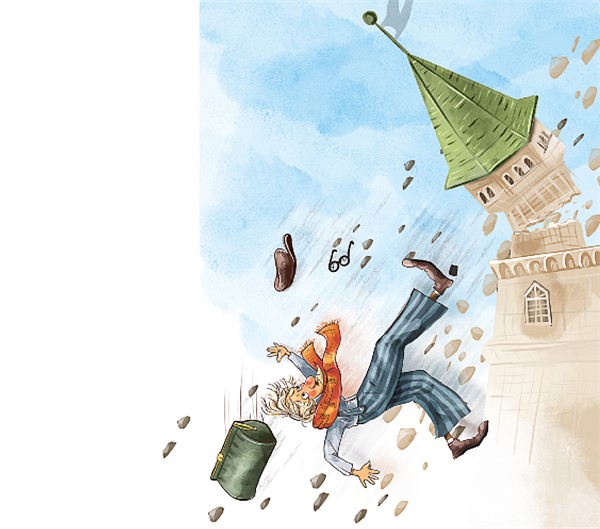 В это время бомба влетела в прачечную. Башня наклонилась, качнулась, одну секунду задержалась в косом положении и рухнула. Доктор полетел кувырком, теряя второй каблук, трость, чемоданчик и очки.