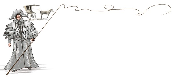 Тут разговору помешало некоторое обстоятельство. На улице появилась необыкновенная процессия. Впереди ехали два всадника с факелами, как огненные бороды. Затем медленно двигалась чёрная карета с гербом.