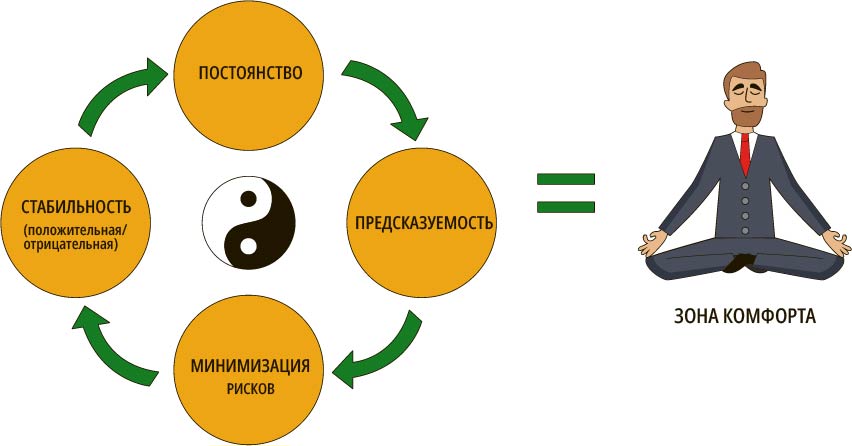 Главное в зоне комфорта – стабильность (положительная или отрицательная), предсказуемость, постоянство и минимизация любых рисков. Человеку удобно и комфортно находиться в состоянии покоя и определенности, неизвестность всегда пугает.