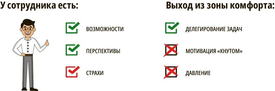 Важно понимать, что при желании можно вытолкнуть из зоны комфорта абсолютно любого сотрудника, даже самого ленивого. Вопрос лишь в том, готовы ли вы тратить на это свое время и прочие ресурсы или же вам проще расстаться с таким человеком и сконцентрировать свое внимание на более активных, которые готовы выйти за пределы привычных условий работы без особых усилий.