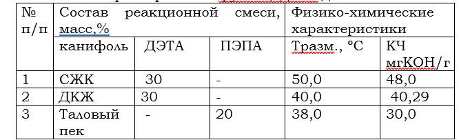 Из данных таблицы1 видно, что обработка канифоли и талового пека аминами приводит к значительному снижению кислотного числа и температуры размягчения (Тразм) получаемых продуктов. Это показывает полноту протекания реакции и отсутствие карбоксильных групп.