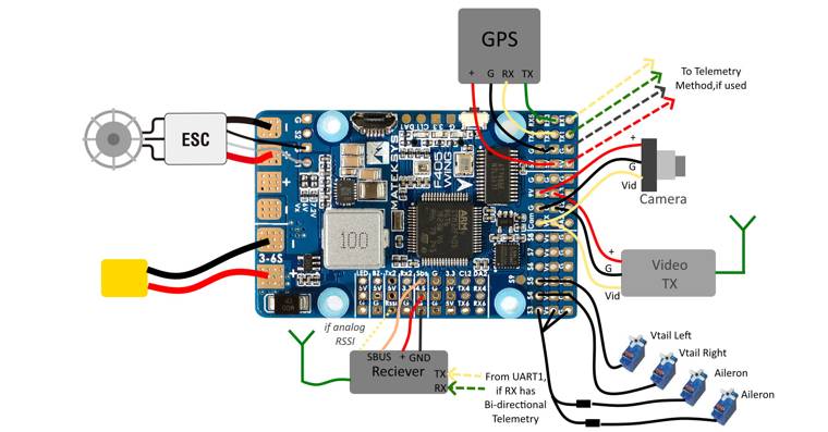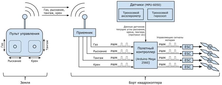 Команды, принятые приемником, поступают в полетный контроллер в виде широтно-импульсного сигнала. Здесь они с учетом текущей навигационной информации (получаемой в самом полетном контроллере от встроенных микросистемных гироскопов и акселерометров), а также с учетом сигналов с модуля GPS (опционально) преобразуются в широтно-импульсные сигналы управления моторами, которые подаются на контроллеры частоты вращения двигателей (т.н. ESC – Engine Speed Control).