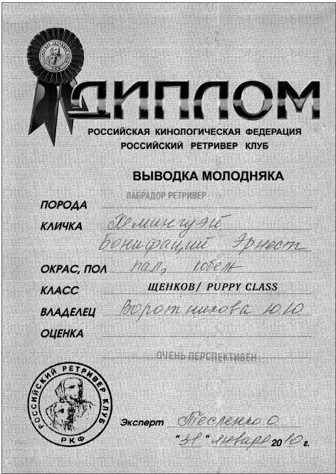 И сам красавец Боня палевого окраса был в российском клубе лабрадоров-ретриверов зарегистрирован и даже посетил однажды, в ранней юности, специальную выставку молодняка. В выданном ему тогда дипломе, у меня сохранившемся, так прямо и написано: «Очень перспективен». Но больше ни в каких собачьих великосветских тусовках Боня замечен не был. Плевали на эту сторону жизни пса его нерадивые хозяева, да и вообще о его экстерьере заботы почти не проявляли. И это, конечно, плохо. С годамии Боня нагулял весомую попу и лишний жирок на боках.