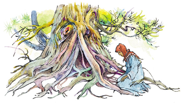 Ходила Потвора в тайную избушку, где стоит идол Домового, отнесла ему хлеба, мяса и молока, умоляла вывести из лесу её сына, если он заплутал. Ходила она с подношениями и в дебри лесные, к огромной, в три обхвата, сосне, умоляла Лешего, если он держит её сына, отпустить его домой. Однако сына нет как нет.