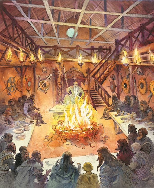 Просторная гридница, где происходят пиры конунга Хальвдана Чёрного, освещена множеством жировых светильников, они укреплены на железных костылях, вбитых в брёвна стен. Посреди земляного пола пылает очаг, перед ним расположено почётное сиденье конунга, украшенное с двух сторон резными столбами.