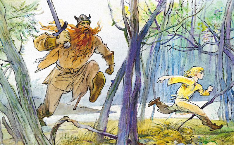 Наконец Свавильд пришёл в себя, и мы тронулись. Представьте себе наше изумление, когда мы переправились через реку и на другом берегу увидели мальчишку! Он был цел и невредим, даже рубаха на нём была сухая. Он преспокойно спал, а в руке держал пращу, заряженную хорошим камнем. Упрямый волчонок снова подстерегал Свавильда! Однако ждать ему пришлось слишком долго, и бедняга крепко уснул.