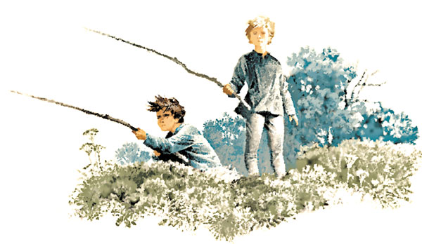 Покатавшись на лодке, мальчики стали купаться. Они грелись на солнце, били слепней, вскакивали и носились друг за другом, кидаясь травой и землёй. Потом, грязные, снова прыгали в воду.