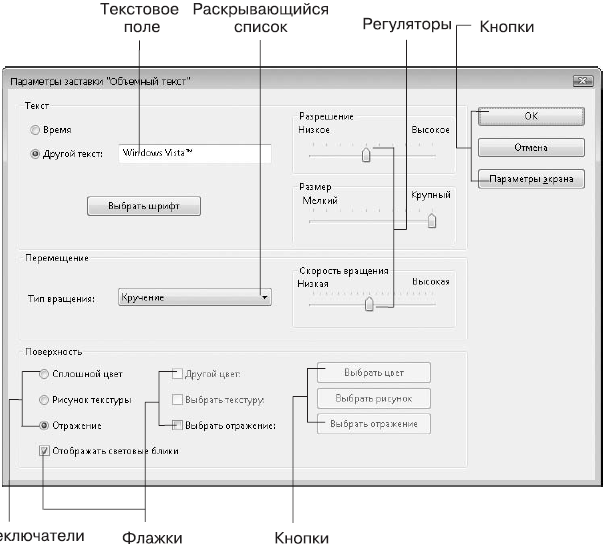 □ Регулятор. Служит для плавного изменения определенного параметра путем перетаскивания ползунка с помощью мыши. В рассмотренном окне параметров заставки (см. рис. 1.15) также есть несколько регуляторов – Разрешение, Размер и Скорость вращения.