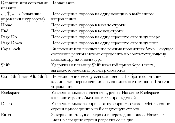 Назначение клавиш для набора и редактирования текста приведено в табл. 1.1.