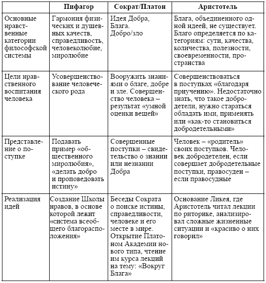 Обобщая вышеизложенное, представим те стержневые идеи философии античных мыслителей, которые отражают важные положения нашего исследования, а именно: в чем древние мудрецы видели предназначение поступка, какие категории лежат в его основе и каковы цели нравственного воспитания человека (см. табл. 2).