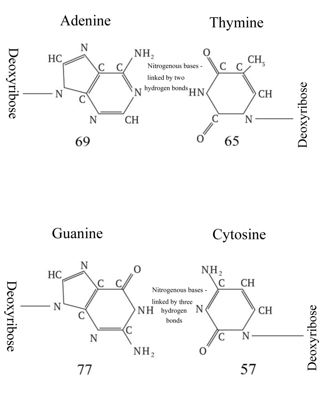 In Adenin beträgt die Gesamtzahl der Elektronen 69, in Thymin 65, in einem anderen Paar enthält Guanin 77 Elektronen, Cytosin 57.