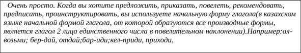 Применяя глаголы тұр, отыр, жүр, жат, айт, ал, апар, асық, атқар, аудар, ауыстыр, аш, аяқта, бақыла, басқар, баста, бер, біл, жаз, жап, жатта, жина, жөнде, кешір, көр, көшір, күт, кір, кел, әкел, кет, әкет, қайтала, қара, қой, қолдан, қос, құрастыр, қысқарт, мақта, окы, орында, оян, өткіз, өшір, бар, сана, сөйле, тап, тексер, толтыр, түзет, түсін, тыңда, тірке, ұмыт, ізде, істе в форме 2-го лица ед. ч., обратитесь к конкретному человеку, порекомендуйте выполнить определенное действие.