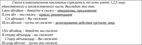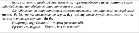 От глаголов тұр, отыр, жүр, жат, айт, ал, апар, асық, атқар, аудар, ауыстыр, аш, аяқта, бақыла, басқар, баста, бер, біл, жаз, жап, жатта, жина, жөнде, кешір, көр, көшір, күт, кір, кел, әкел, кет, әкет, қайтала, қара, қой, қолдан, қос, құрастыр, қысқарт, мақта, окы, орында, оян, өткіз, өшір, бар, сана, сөйле, тап, тексер, толтыр, түзет, түсін, тыңда, тірке, ұмыт, ізде, істе, образовать форму 1 лица единственного числа повелительного наклонения.