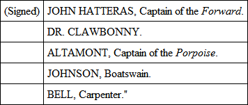 As he spoke, Hatteras was the victim of a violent excitement, a sort of fever, and the doctor in vain tried to calm him. His eyes were strangely bright, and his thoughts were boiling within him. Clawbonny ascribed this condition to the terrible perils he had gone through. Hatteras evidently needed rest, and they set about seeking a place to camp. Altamont soon found a grotto in the rocks, which had fallen in such a way as to form a cavern. Johnson and Bell brought provisions there, and let loose the dogs. Towards eleven o'clock everything was prepared for a meal; the canvas of the tent served as a cloth; the breakfast, consisting of pemmican, salt meat, tea and coffee, was set and soon devoured. But first, Hatteras demanded that an observation should be made; he wanted to know its position exactly. The doctor and Altamont then took their instruments, and after taking an observation they found the precise position of the grotto to be latitude 89° 59' 15". The longitude at this height was of no importance, for all the meridians run together within a few hundred feet higher. So in reality the island was situated at the North Pole, and the ninetieth degree of latitude was only forty-five seconds from there, exactly three quarters of a mile, that is to say, towards the top of the volcano. When Hatteras knew this result, he asked that it should be stated in two documents, one to be placed in a cairn on the shore. So at once the doctor took his pen and wrote the following document, one copy of which is now in the archives of the Royal Geographical Society in London: —