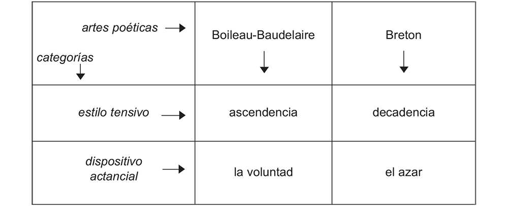 Las dos poéticas comparadas suponen competencias modales opuestas, cada una con su lado positivo y su lado negativo. Si Boileau y Baudelaire ponen por delante el “tesoro variable de la voluntad”, es decir, un querer-querer, dicho de otro modo, la forma redoblada, amplificada, retórica del querer, el surrealismo prefiere en principio practicar la abstención y dejar el campo libre a lo fortuito, es decir, a ese azar cuya denegación ha obsesionado permanentemente a Mallarmé: “… y cuando el azar, vencido palabra por palabra, se alinea en alguna medida, por pequeña y diseminada que sea, el blanco regresa indefectiblemente, gratuito hasta hace un momento, inevitable ahora, para concluir que nada hay más allá y para autenticar el silencio”,27 e indudablemente uno de los grandes méritos de Breton es el haber mostrado que la actitud surrealista exige una energía tan obstinada, tan vigilante como aquella de la que se jactaba el voluntarismo estético, dominante hasta ese momento. Tenemos, entonces: