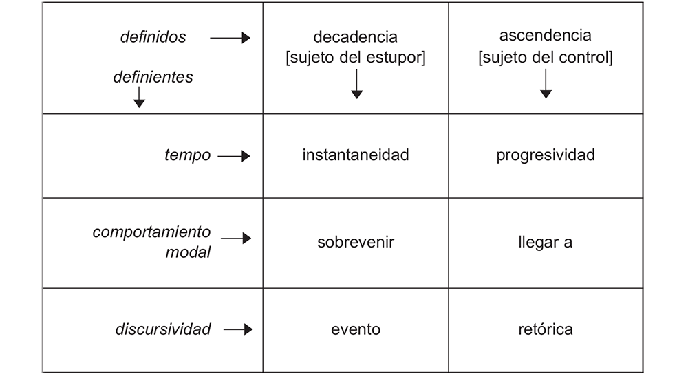 La segunda precisión tiene que ver con el estatuto de la afectividad y con las incertidumbres que siguen rodeándola por lo que se refiere al lugar que se le asigna. Entre el psicoanálisis, que la erige en directriz constante de las manifestaciones y de los discursos tanto individuales como colectivos, y la glosemática, que la virtualiza al reducir la semántica a la sola sustancia del contenido,18 no es previsible la conciliación, a pesar de la buena voluntad expresada por ambas corrientes. Dicha confrontación deriva la cuestión hacia la necesidad o no del fundamento de las disciplinas: ¿le conviene a una disciplina que trata de ser rigurosa rechazar toda heteronomía, toda vinculación con otras disciplinas? ¿O es preferible buscar alguna dependencia en relación con un conjunto de postulados conexos e irrecusables? La cuestión ha sido planteada y sigue planteándose en el campo de las matemáticas,19 y Hjelmslev mismo ha tratado —sin ocultarlo apenas— de “adherirse” a la epistemología de las matemáticas.20 Personalmente, si al modo del psicoanálisis, mantenemos la presunción de una dependencia del sentido en relación con la afectividad,21 sugerimos no obstante el desplazamiento siguiente: mientras que el psicoanálisis propugna una anterioridad insuperable de la afectividad, reduciendo el presente a un rebrote y a una hipotiposis apenas enmascarada del pasado remoto del individuo, calificado como “reprimido”, nosotros inscribimos la afectividad en sincronía, como un conjunto de funcionamientos descriptibles, analizables y sobre todo “gramaticalizables”, y, bajo esas premisas, creemos que atribuimos a la afectividad tanto su “eficiencia” (Cassirer) como su “inmanencia” (Hjelmslev). Con ese doble título, incorporamos la afectividad, bajo el nombre de intensidad, como uno de los dos ejes constitutivos del espacio tensivo. La tabla siguiente completa las fisonomías respectivas de la decadencia y de la ascendencia tensivas:
