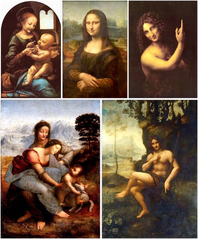 «Мадонна Бенуа» (она же «Мадонна с цветком»), «Джоконда (она же «Мона Лиза»), «Иоанн креститель», «Св.Анна с Марией и младенцем Христом», «Вакх» (он же «Иоанн Креститель»).