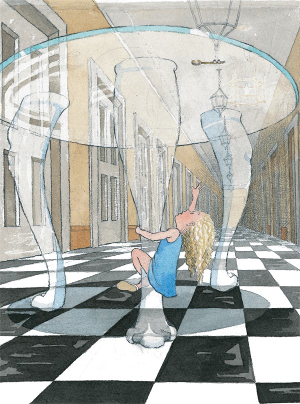 В зале было множество дверей, но все они были заперты – Алиса убедилась в этом, подёргав каждую. Огорчённая, она бродила по залу, раздумывая, как же ей выбраться отсюда, и вдруг увидела в центре зала столик из толстого стекла, а на нём золотой ключик. Алиса обрадовалась, решив, что это ключ от одной из дверей. Увы, ключ не подошёл ни к одной: одни замочные скважины были слишком большими, другие – слишком маленькими.